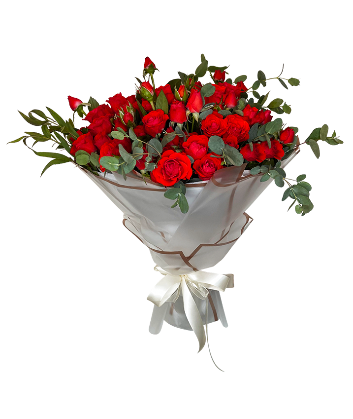 This contemporary arrangement comprises approximately 99 mini spray roses in vibrant red to convey your forever love. Paired perfectly with seasonal foliage, the classic red rose speaks a language of profound love, admiration, devotion and respect.