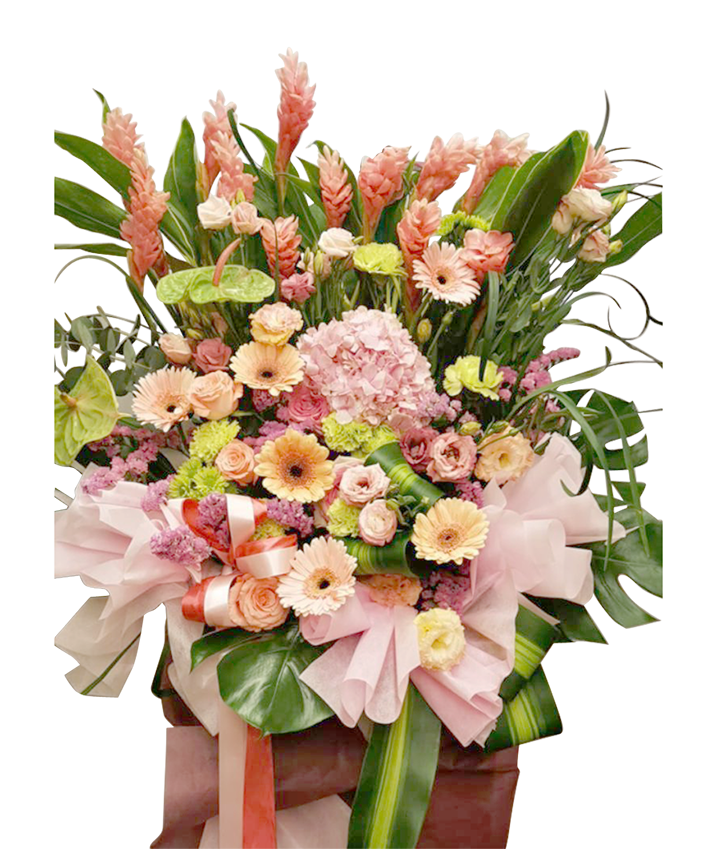 This opening stand is designed to celebrate new beginnings with a refreshing blend of soft peach, pink, and green tones, brought together in a full and thoughtfully arranged display. The combination of colours and textures represents growth, positivity, and well wishes for the journey ahead.